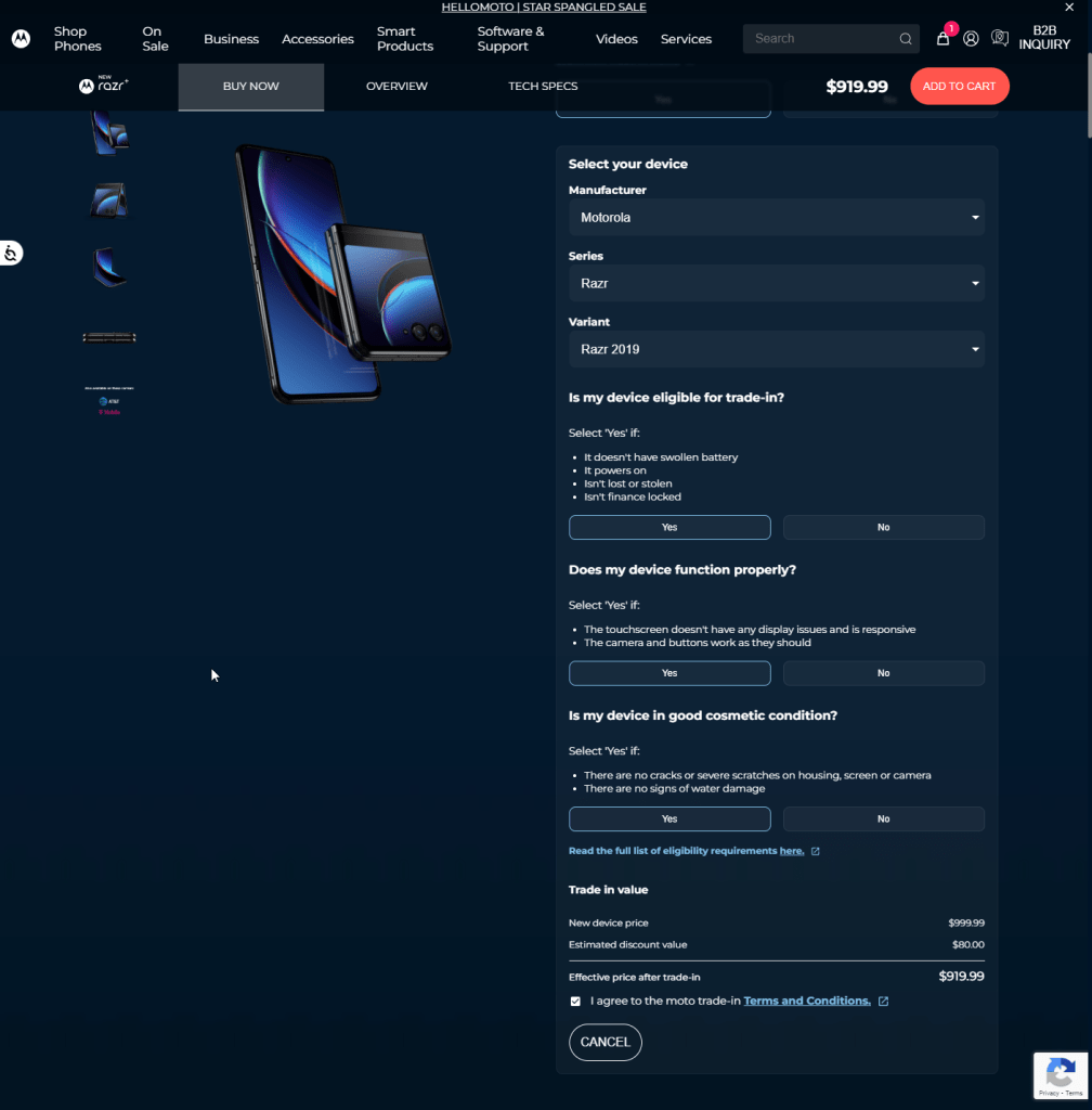 At Motorola.com, you can get as much as $350 for a trade-in on your existing smartphone towards the Razr+. That cuts the price to $649, which isn’t too bad. But it’s not great when you consider what gets that full $350.