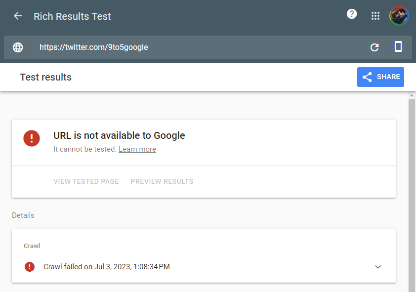This is because Google can no longer “crawl” Twitter URLs, as proven by Google’s own testing tools.