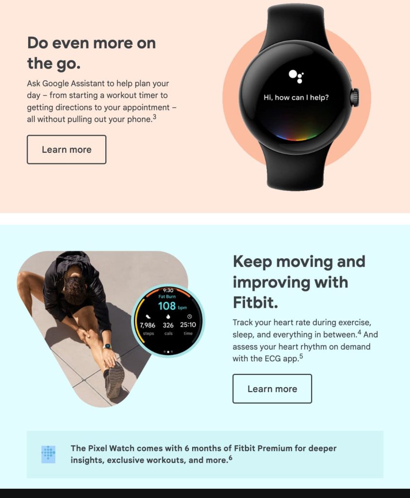 The premise of this campaign is that the Pixel Watch is the “perfect companion to your Pixel phone.” (That being said, I’m not quite sure why I received one, as I already own a Pixel Watch.) Google Assistant, for starting workout timers and getting directions “without pulling out your phone,” is the first highlight. That’s followed by Fitbit to track heart rate, sleep, and take ECG readings, with six months of Fitbit Premium touted.