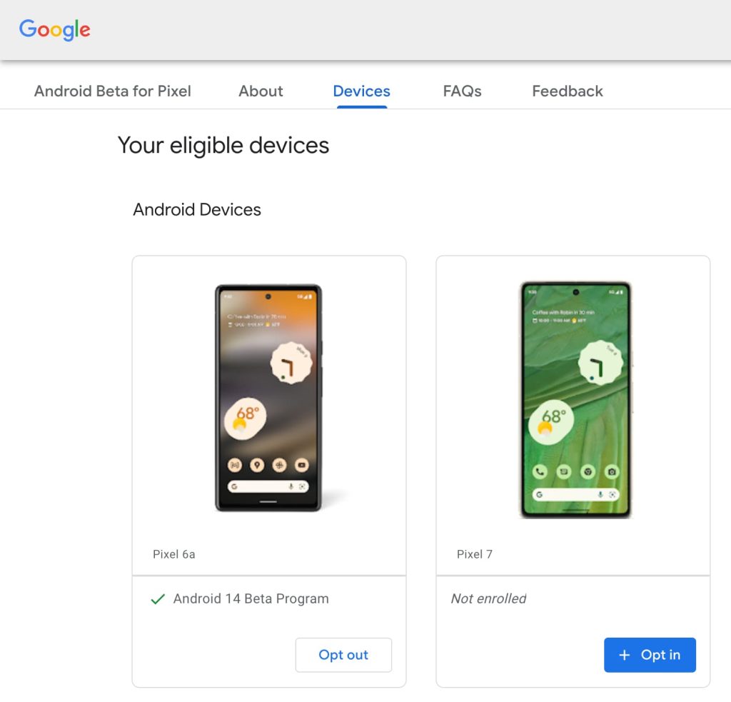 Notably, the “Your eligible devices” section recently rephrased things so it reads “Android Devices” instead of “Phones.” (That makes way for the Pixel Tablet and Fold, which will presumably arrive with Android 14 Beta 4.) We expect a new carousel/section for Wear OS when that Beta Program launches.
