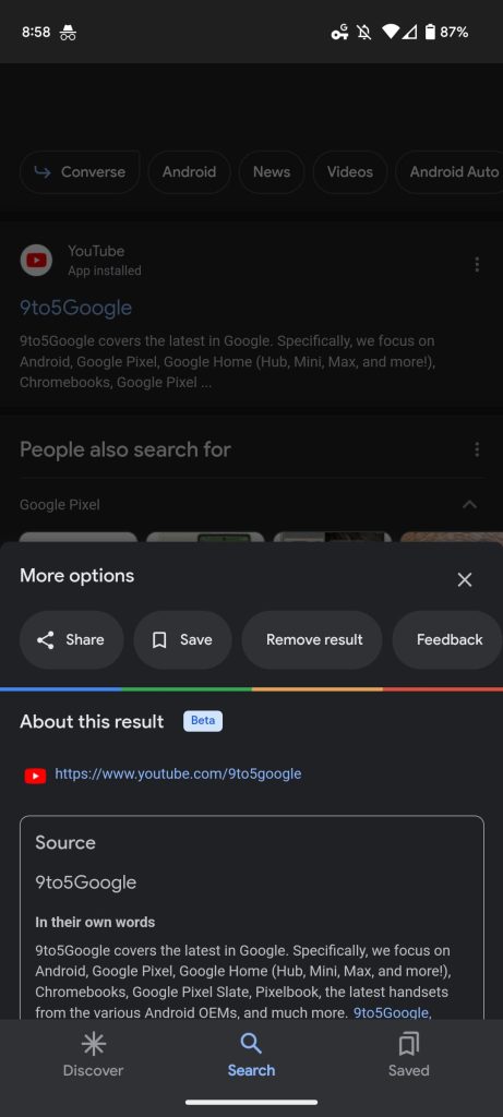 Sharing brings up either the Chrome share sheet or Android’s native panel if you’re using the Google app. It includes the site name and URL by default, while the bookmark icon adds it to the “Saved” (google.com/save) Collections feature. On mobile, the Add to Sheets experiment, which you have to enable, does not show up.