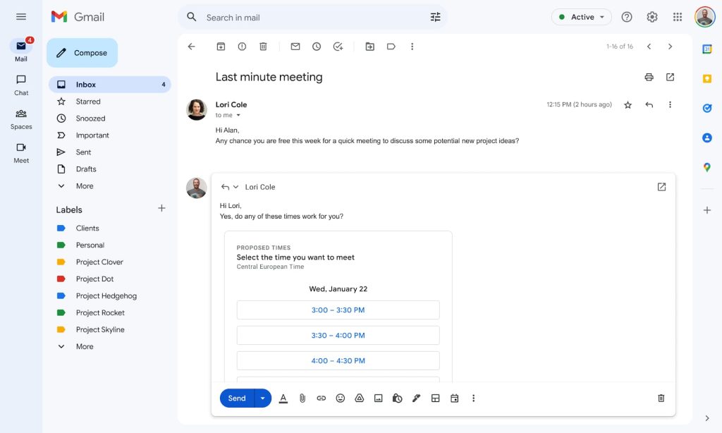 - Offer times you’re free: This new option opens the Calendar side panel, where you can “select and insert proposed meeting times” by highlighting what’s free in your primary calendar across multiple days. Recipients will be able to select one of the proposed times via an interactive email reply, and this will automatically generate a Calendar invite after confirming their name and email address.