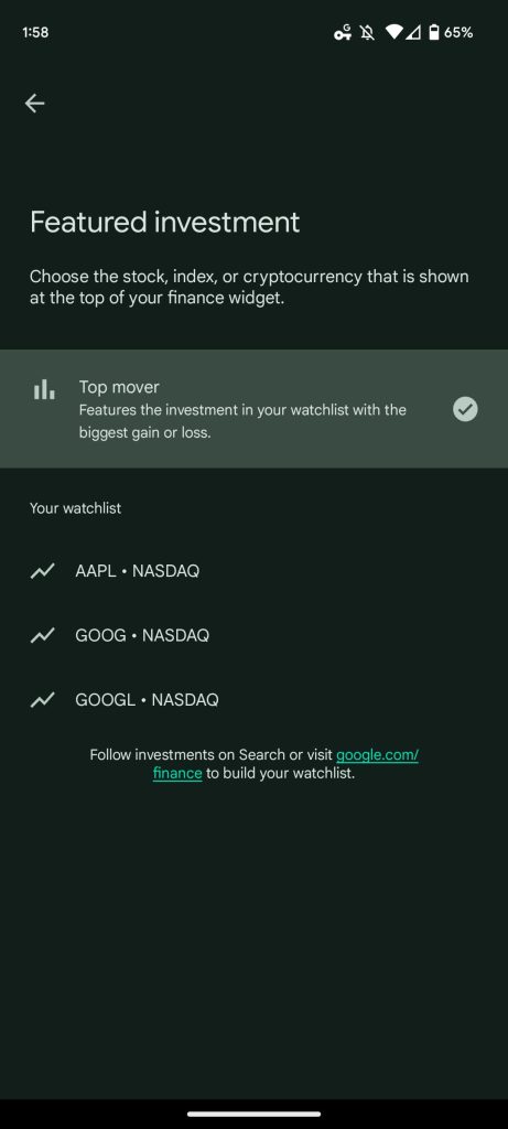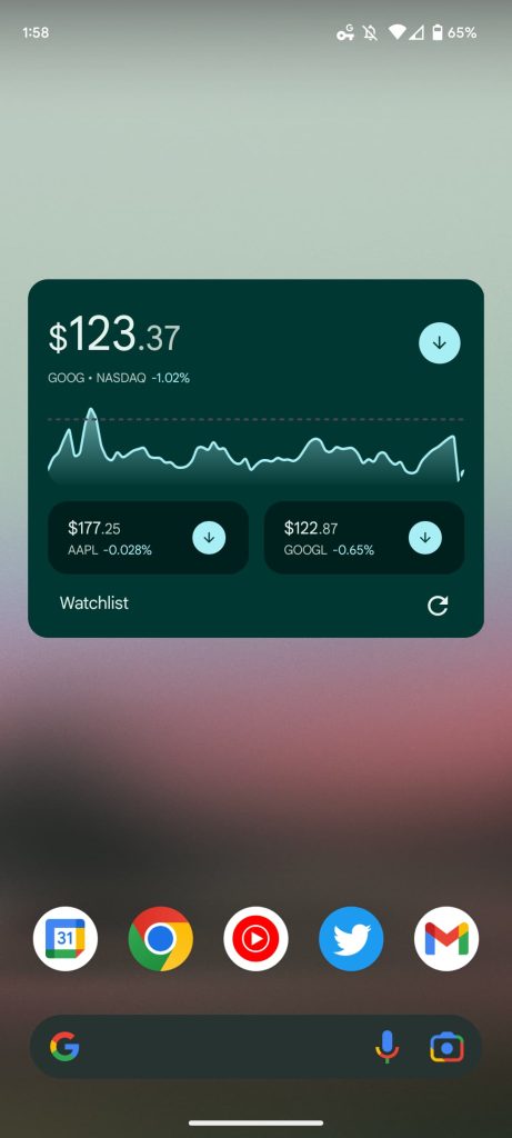 Original 5/31: Joining two Weather widgets (exclusive to Pixel devices), the Search bar, At a Glance, and Sound Search is a “Finance Watchlist.” It’s meant to let you “Follow stocks, indexes, and crypto on Google Search to build a watchlist.” The stocks here are sourced from google.com/finance, which got its last major update in September 2020.
