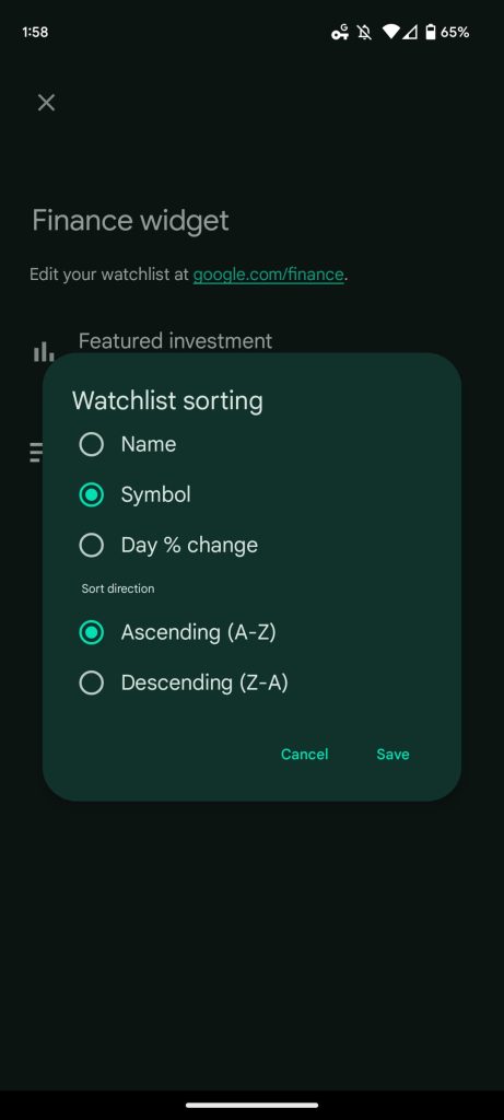 Customization options let you set the “Featured investment.” You can pick the “Top mover” with the “biggest gain or loss” or select a specific stock to pin. “Sorting” lets you choose between name, symbol, or day % change, sorted by ascending or descending values.