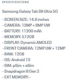 According to images and a spec sheet posted by Evan Blass on Twitter before Samsung quickly removed it, the Galaxy Tab S9 Ultra will include the same 14.6-inch AMOLED display and a similar overall package, though with some improvements littered throughout.