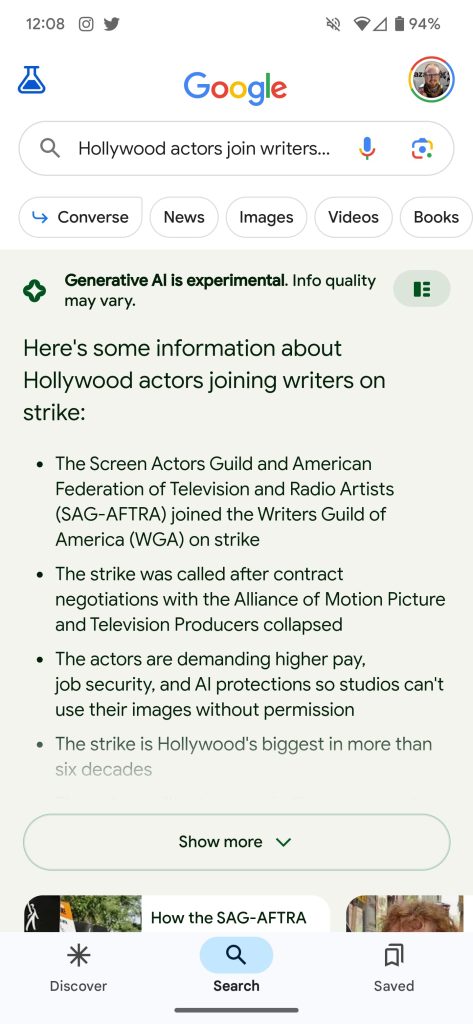 As you’d expect, tapping the new search bar brings you directly to a Google Search for the phrase shown. In the first example below, a preview of an article about the current labor strikes in Hollywood is prefaced with a search suggestion for “Hollywood actors join writers on strike.” In another instance, a suggestion for “samsung tv deals” is shown above a grid of four retail listings for televisions.