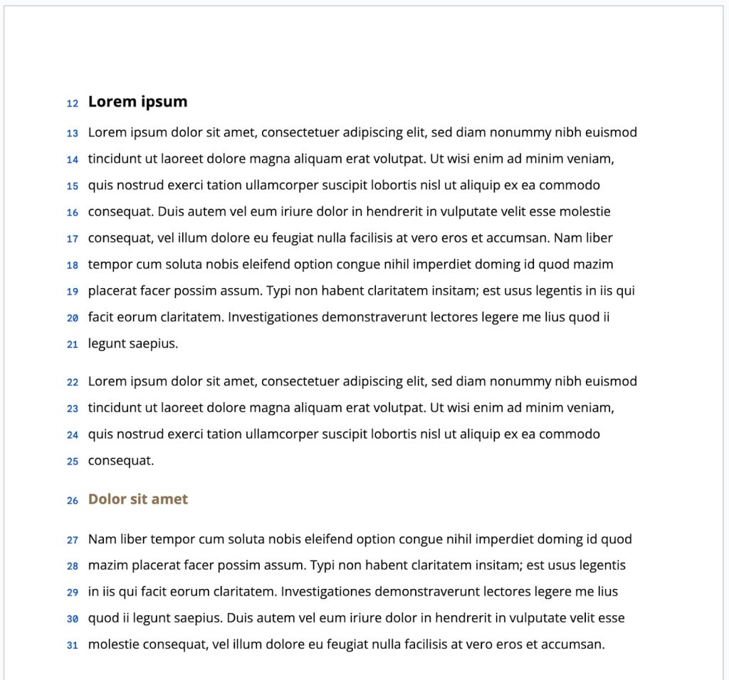 Commonplace in legal documents, Google Docs will automatically calculate and show numbers next to each line in a document and appear when printed out. This can be set to show on just a specific section, page, or entire documents.