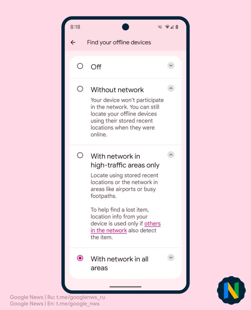 There’s the ability to find devices without using the network at all. This will enable users to locate offline devices based on their last known location, which is how things work today. When using the network, you’ll have the option to turn it on at all times, or just in locations with “high traffic,” which Google explains as places like an airport.