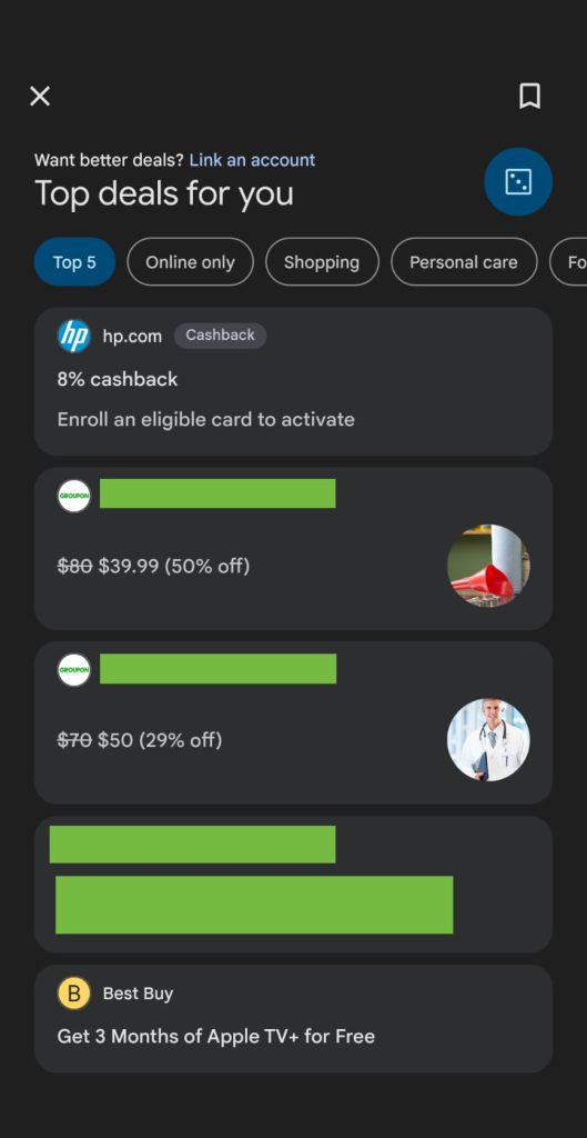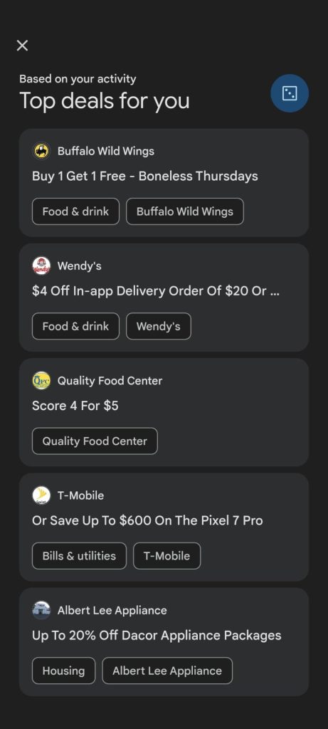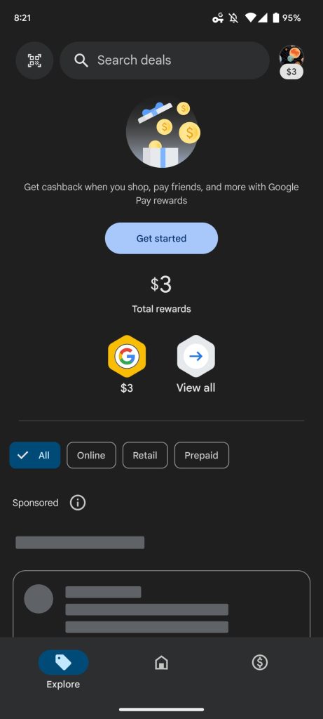 Original 2/24: Since launch, GPay has been organized by Explore, Pay, and Insights. That first tab showed deals, and it’s now just a card in the Pay tab that opens a fullscreen feed. This section is called “Top deals for you” and is “Based on your activity.”