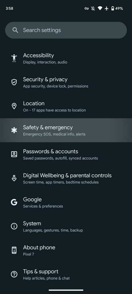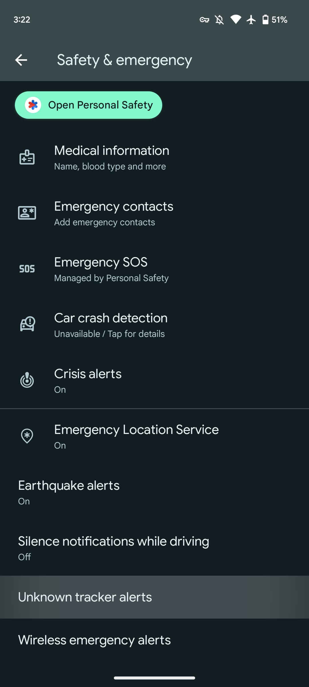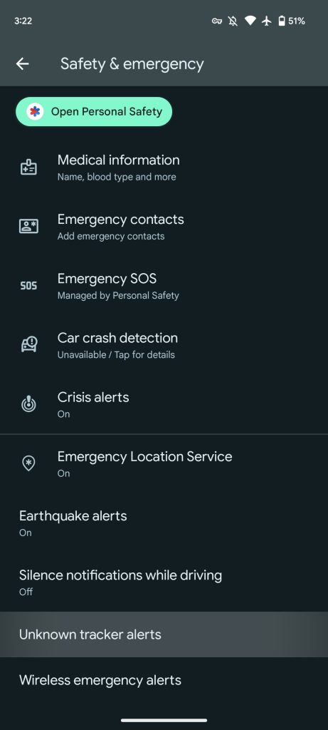 To check that this system is running, open your phone’s Settings app and then the “Safety & Emergency” section on Android 12 and newer – or “Personal safety” on Android 11 and older – where there should be a new “Unknown tracker alerts” menu.