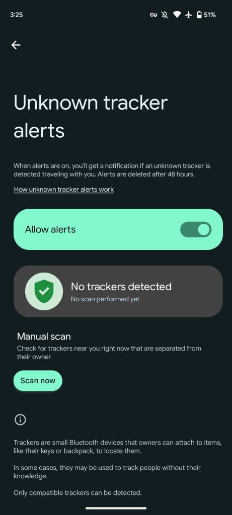 The “Allow alerts” switch is on by default, with Google warning how turning it off means “your phone will no longer automatically scan for trackers that are traveling with you.” Additionally, “previously detected trackers will be deleted immediately.”