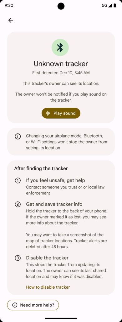 When you receive a “Tracker traveling with you” notification, tapping it opens a map to see travel history. You can “Play sound” to help find it, which will not notify the owner.