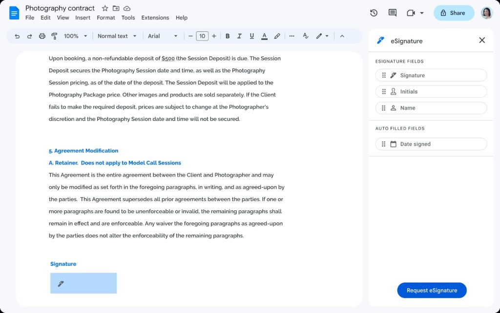 At the moment, eSignature for Docs is available in open beta (no additional sign-up required) for Google Workspace Individual users. It’s aimed at “solopreneurs and small businesses” that need an easy way to track “contracts, customer agreements, and other binding documents.”