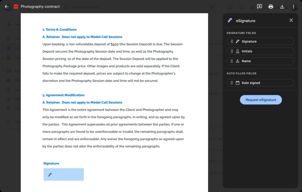 - “Initiating eSignature on PDF: the ability to initiate an eSignature on PDF files stored in Drive”