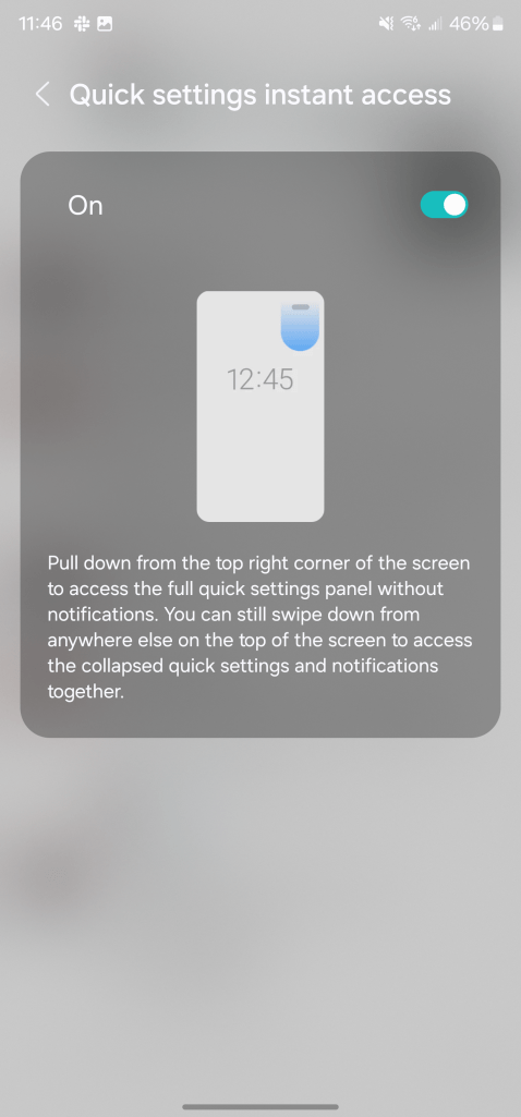 Instantly access the full quick panel – By default, a compact quick panel with notifications appears when you swipe down from the top of the screen. Swiping down again hides notifications and shows the expanded quick panel. If you turn on Quick Settings instant access, you can view the expanded quick panel by swiping just once from the right side of the top of the screen. Swiping down from the left side shows notifications.
