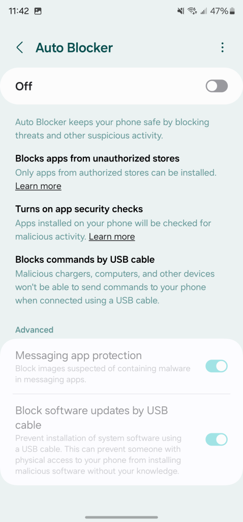 Block security threats – Get an extra level of protection for your apps and data. Auto Blocker prevents unknown apps from being installed, checks for malware, and blocks malicious commands from being sent to your phone using a USB cable.