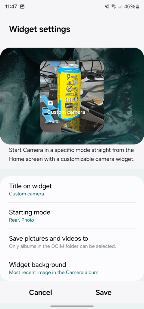 Samsung is also further doubling down on widgets. There’s a new camera widget that’s fully customizable. The widget opens up the camera app, but can open it to a specific setting as well as saving the image then taken to a specific album. You can customize the widgets title and background, too.