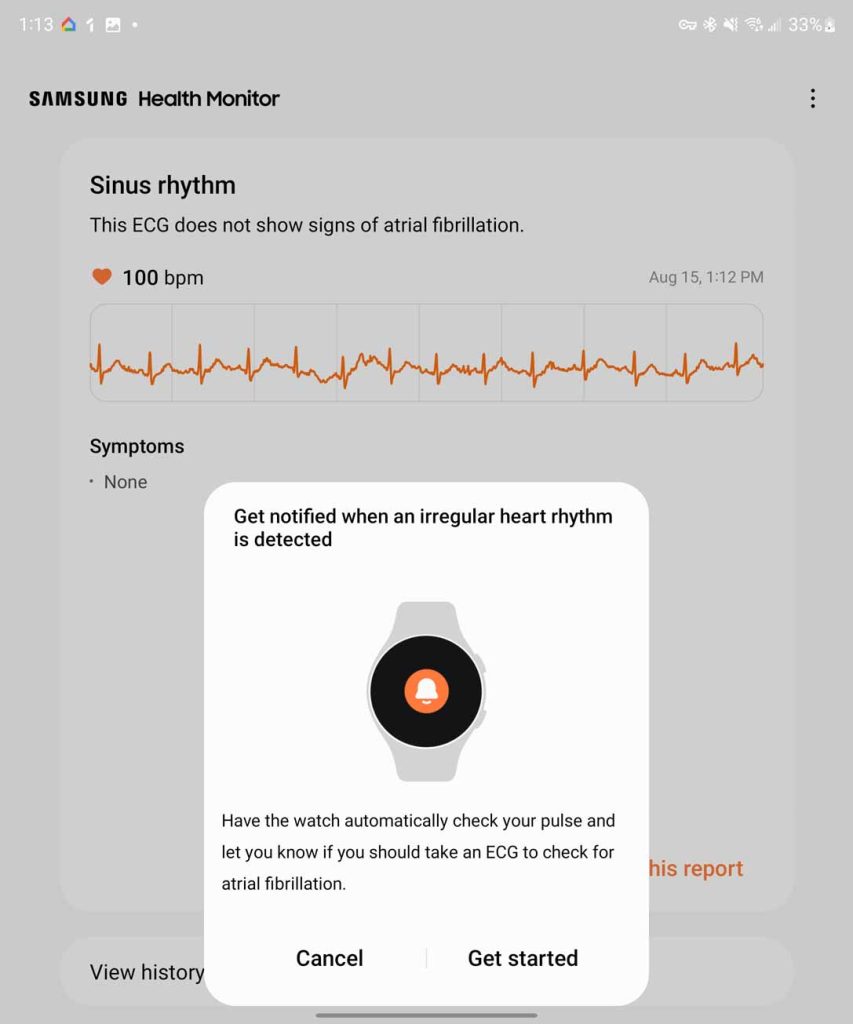 - On your phone’s ECG app, you should see the new reading along with a card that lets you know about irregular heart rhythm notifications. Hit Get started.