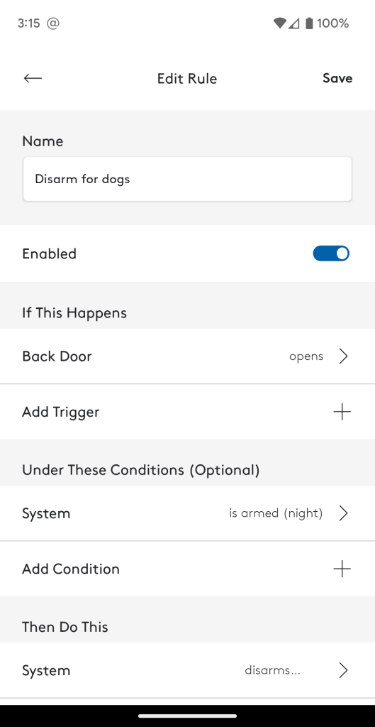 You can also set up automations within the ADT app that use sensors and ADT hardware. This can’t interact with Nest devices or anything else in your home, but it has its use cases. For instance, I set up an automation with one of my door sensors which would automatically disarm the system in the morning if I opened my back door within a certain window of time. While that did slightly lessen the system’s security, it also led to far fewer false alarms when we forgot to disarm the system before letting the dogs out in the morning.