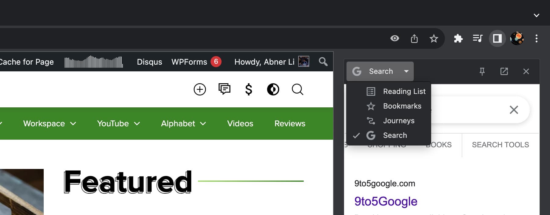 Meanwhile, you’re able to pin — next to the close button — this side panel so that you get a “G” shortcut to the right of the address bar that will immediately open the Search field. Otherwise, you have to first open the side panel and then the dropdown to access Search at the bottom.