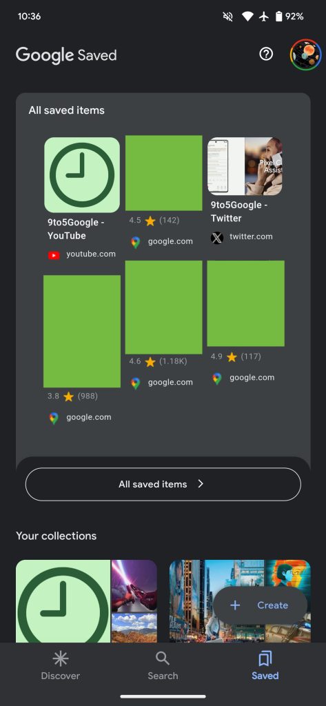 Besides the Google app on Android and iOS, you can access it from google.com/saved where “Google Saved” appears again. You’ll see a grid of “All saved items” followed by all “Your collections.” There’s a “Create” FAB in the bottom-right corner and the ability to share Collections with others.