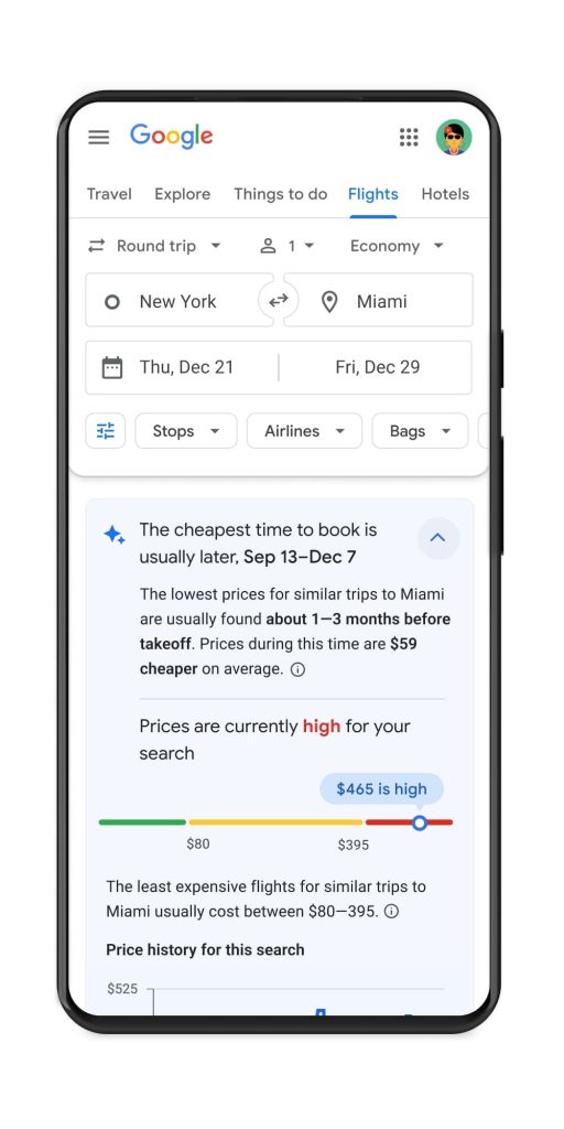 …these insights could tell you that the cheapest time to book similar trips is usually two months before departure, and you’re currently in that sweet spot. Or you might learn that prices have usually dropped closer to takeoff, so you decide to wait before booking.