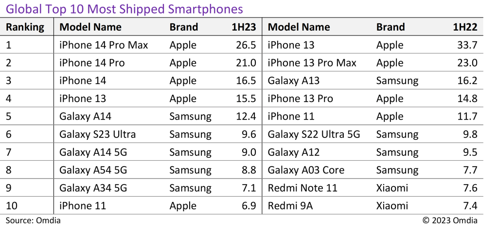 Omdia this week published a report on the top 10 smartphones in the first half of 2023 broken down by model. Unsurprisingly, Apple’s iPhone makes up the top four models. iPhone 14 Pro Max is at the top of the list with 26.5 million units, with iPhone 14 Pro just behind at 21 million, and iPhone 14 and iPhone 13 at 16.5 and 15.5 million respectively.