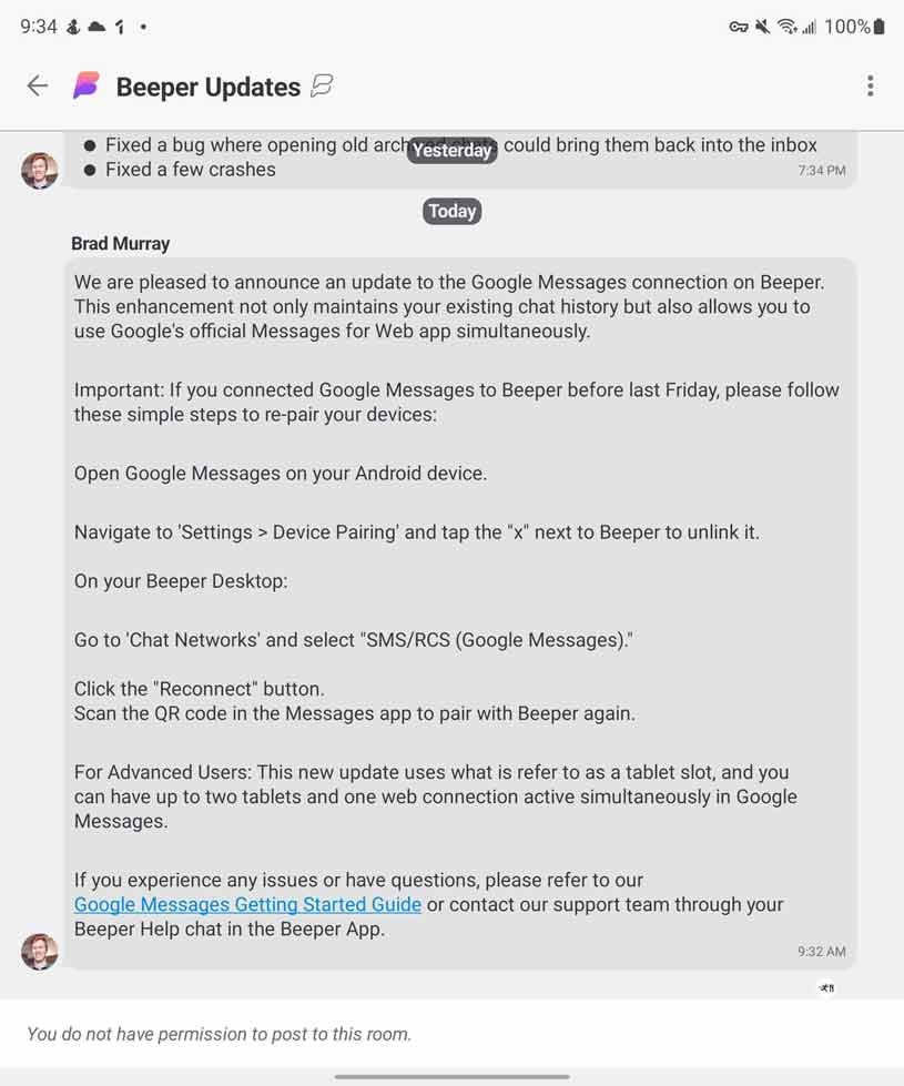 Now, the Beeper app is expounding on that. The latest update (2.21.1) adds the ability to use the Google Messages web client at the same time as Beeper, much like you’d use the official app in conjunction with the online version. Beeper acts as a tablet connection, which allows it to tie in live to the web client and show messages as they’re sent or received.