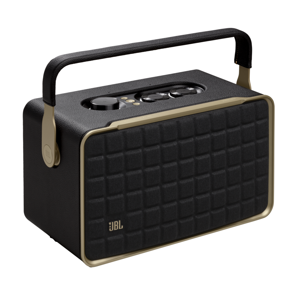 Design-wise, inspiration was drawn from the 1970s-era JBL L100 speaker, specifically the grid pattern on the grill. There’s a “premium” aluminum frame and “custom synthetic leather-wrapped enclosure.” Physical controls on the top surface include play/pause, treble, bass, and Bluetooth.