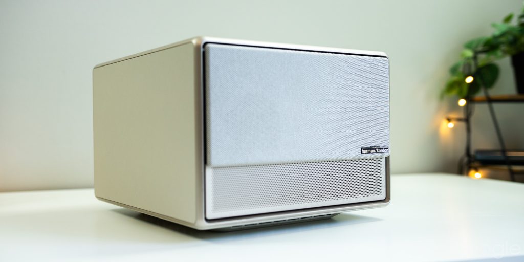 The Xgimi Horizon Ultra is what I would classify as a “portable” projector. It doesn’t have a built-in battery like some, but it’s small enough to be easily moved around the room. At first glance, it looks like an expensive square speaker – it’s encased in PU leather and cloth, which gives it a modern aesthetic. However, tapping the power button on the back sets a motor in action that smoothly pulls part of the facade down, revealing the projector lens and sensors.