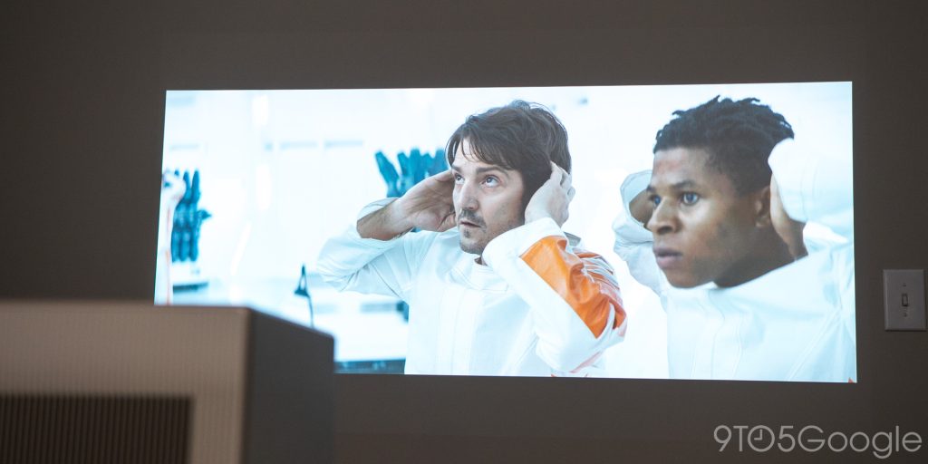 We’ll preface it with this – you’ll need to draw your shades and turn off any ambient light. In that situation, you’ll get a good picture with easy-to-see bright scenes and acceptable dark ones. But even if you don’t do that, image quality is much better than other traditional long-throw projectors we’ve used. It’s of course nowhere near as perceptible as an OLED or LED TV, however, this long throw is starting to creep into the benefits of a short throw, even with an average Lumen count.