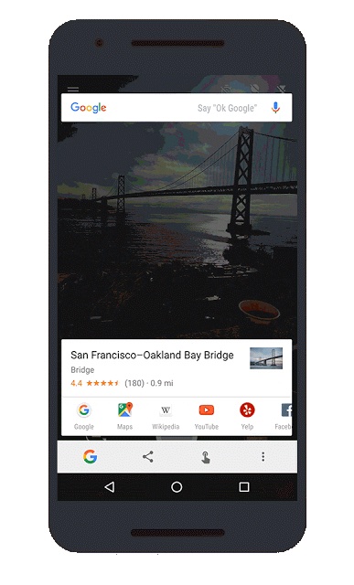 - “If you’re standing in front of the Bay Bridge, you can hold up your phone, open your camera app, touch and hold the home button, and get a helpful card with deep links to relevant apps. This works for more than just famous structures like the Bay Bridge, you can even point your camera at a movie poster or magazine and get additional info about what you’re looking at.”
