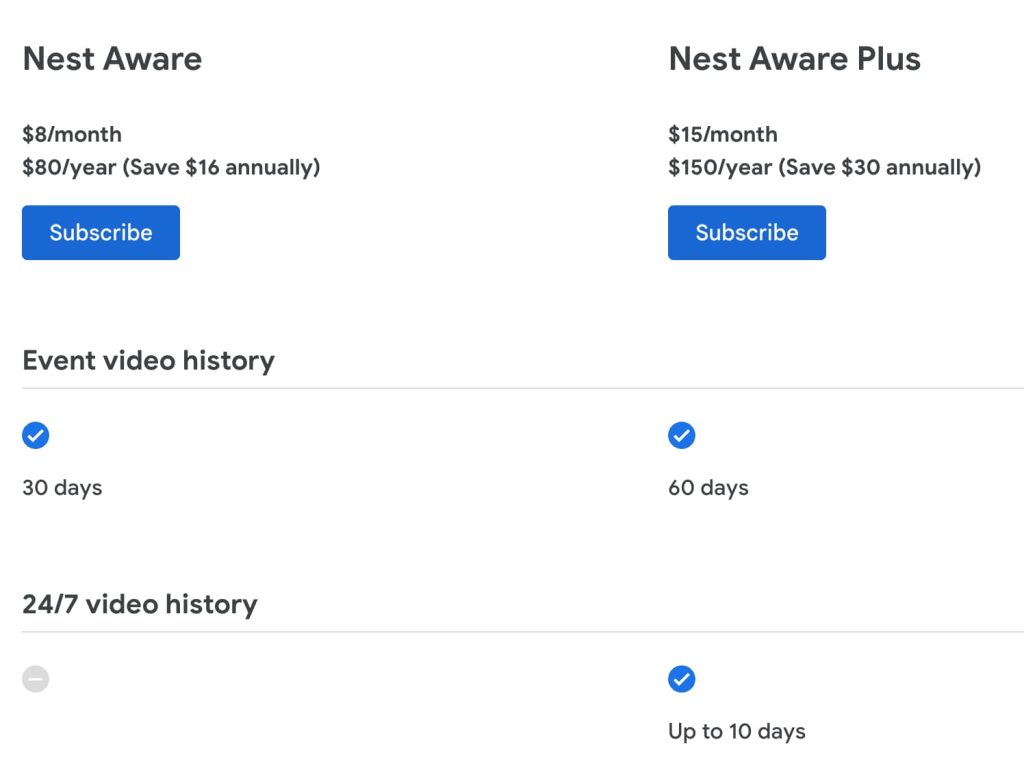 Meanwhile, Nest Aware Plus now costs $15 per month or $150 annually ($30 savings), compared to $12/month and $120/year. The big upgrade here is up to 10 days of 24/7 video history and 60 days of event video history.
