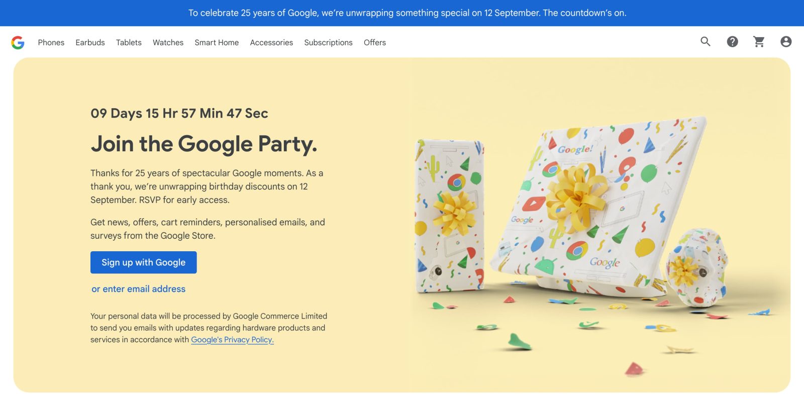 We’re seeing this “Join the Google Party” promo in the UK, Ireland, France, Germany, Italy, Spain, Denmark, Netherlands, Norway, and Sweden: “Thanks for 25 years of spectacular Google moments. As a thank you, we’re unwrapping birthday discounts on 12 September. RSVP for early access.”