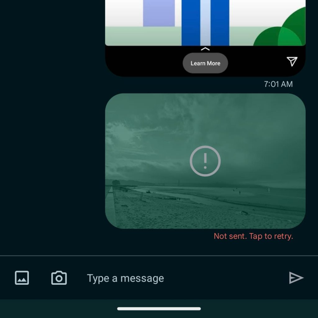 Specifically, images and files over 2MB will attempt to upload before failing, showing an exclamation mark over the photo and a “Not sent. Tap to retry” warning in red below. We’re encountering this issue on Google Voice for Android this morning.