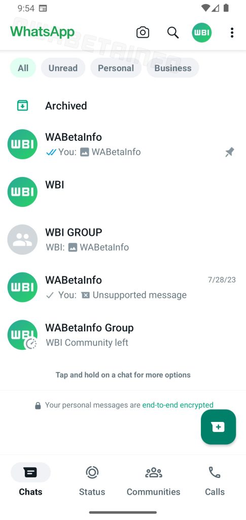 There are also new filters at the top of the chats list, with filters for all, unread, personal, and business chats. That functionality doesn’t exist for most users today, but has appeared in other versions of this upcoming redesign.