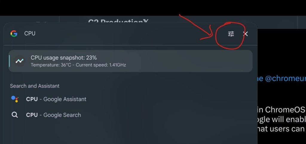 This shows up as a new settings icon to the right side of search results, and also is accompanied by a previous discovery that the launcher can show interactive “cards” from the Diagnostics app, such as showing the CPU temperature without opening the full app as pictured below.