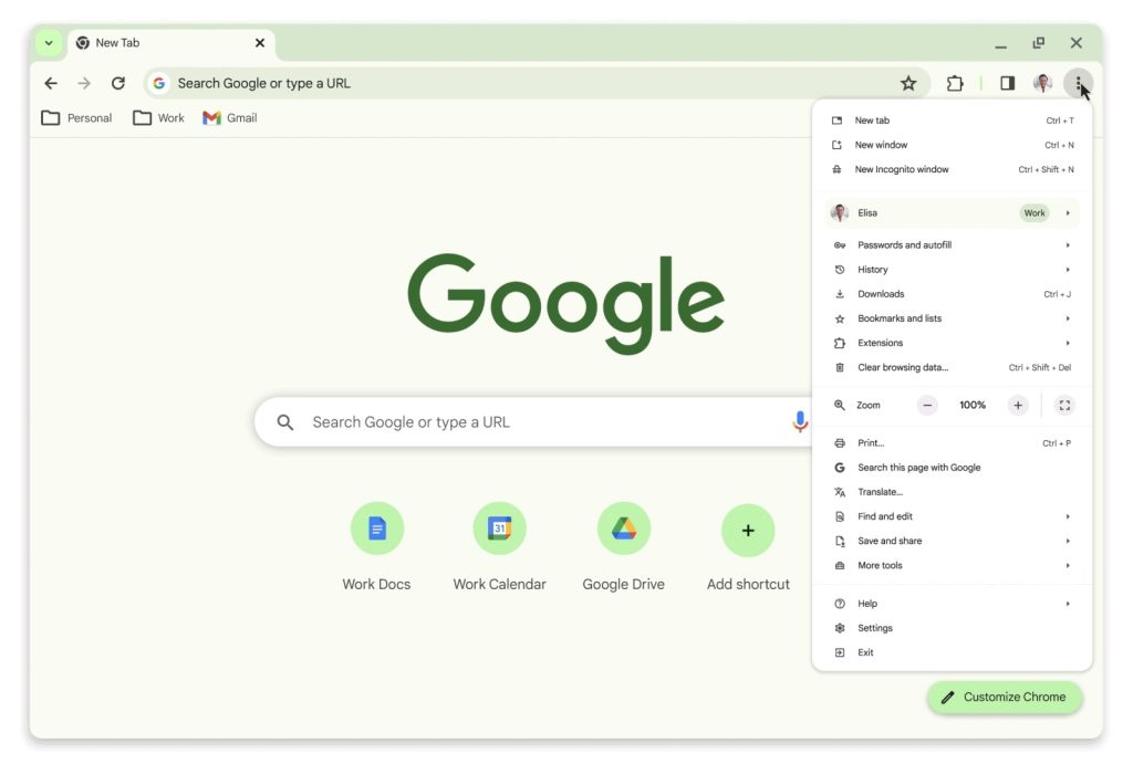 Color plays a significant role in this Material You redesign, introducing new palettes “that better complement your tabs and toolbar.” This is best experienced when not using a dark theme. From the New Tab Page, click Customize Chrome in the bottom-right corner to try them out.