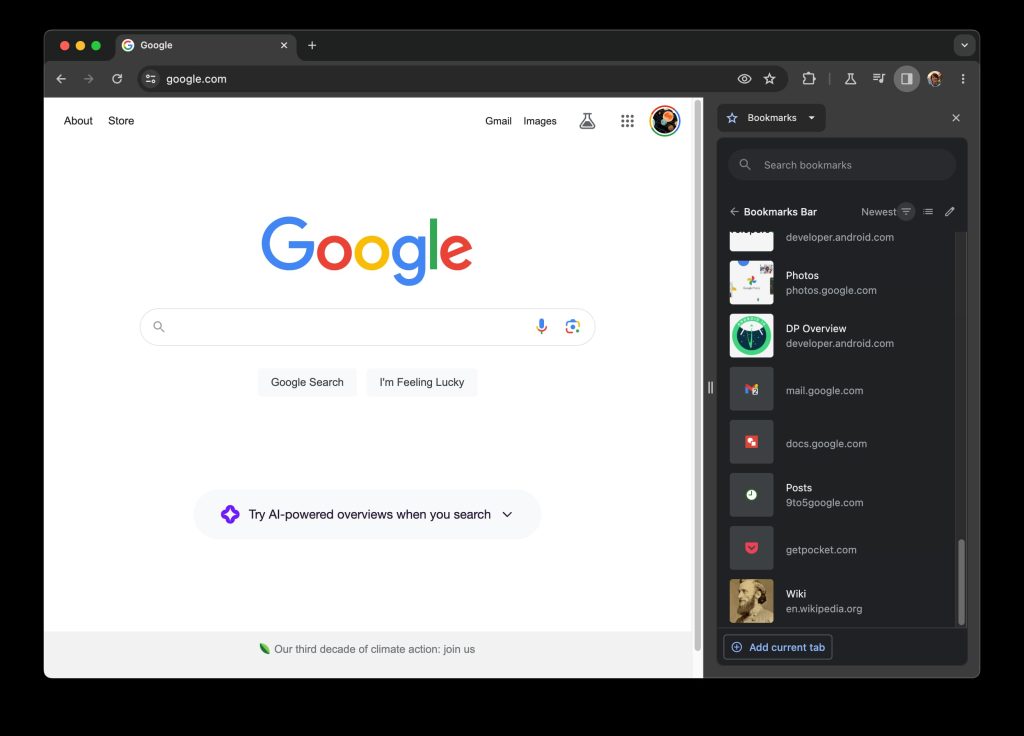 Chrome’s persistent side panel continues to grow in functionality and is now home to “All Bookmarks.” You’ll also find a “Search this page with Google” feature that opens a panel for highlighting images and related queries.