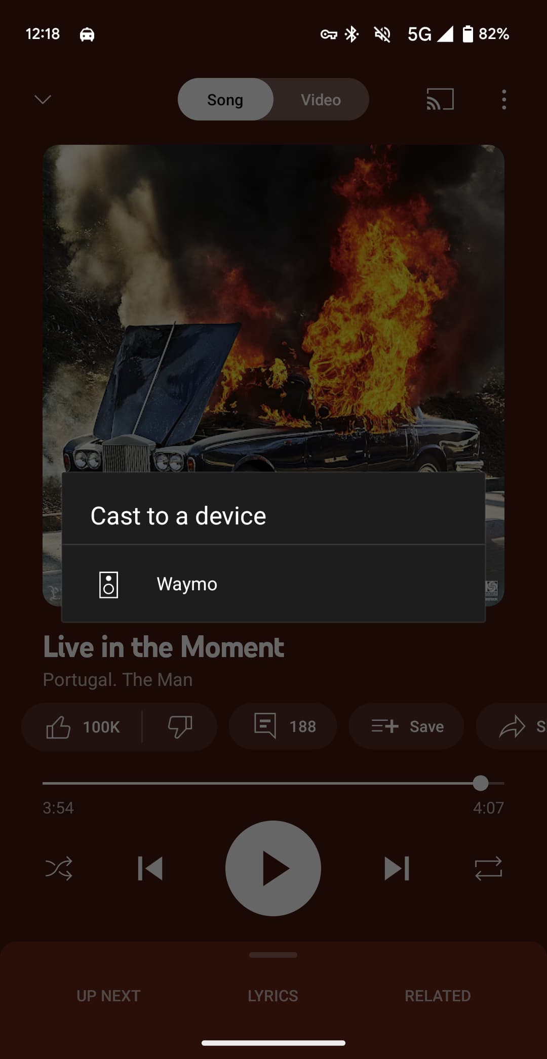 On your phone, the car appears in the standard Cast menu as “Waymo.” You don’t have to be connected to the car’s Wi-Fi network (if one even existed), with Google announcing Cast for cars at I/O 2022. The example provided at the time was Casting a YouTube video to an infotainment screen. This system presumably has a new way to broadcast itself as a Cast receiver without needing to be on a local network, which is somewhat like the old Chromecast Guest Mode that leveraged ultrasonic pairing to transfer a PIN so that you Cast while on a different network or cellular, like I did in the Waymo.
