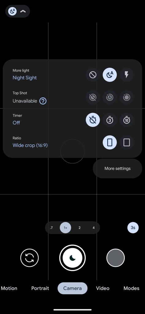 • Photo (L-R): Action Pan, Long Exposure, Portrait, Photo, Night Sight, Panorama, Photo Sphere