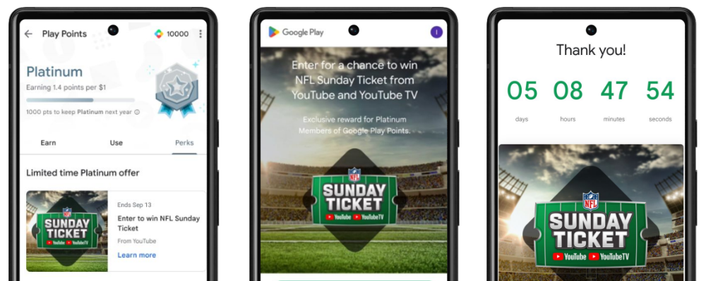 The giveaway, open through September 13, will give users with a Platinum status in Google Play Points a chance to win free NFL Sunday Ticket. Google tells us that 855 winners will be picked out of those who enter in the giveaway. Once winners are picked, they’ll be notified via email.