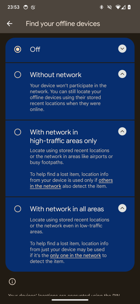 To that end, our team has enabled a new settings page related to the Find My Device network, revealing a choice of how you’d like to locate lost offline devices. The most straightforward of these is “Off,” in which a lost device cannot be found if it doesn’t have internet access. This is how Google’s Find My Device app works today, with a lost Android phone/watch sending its approximate location when online.