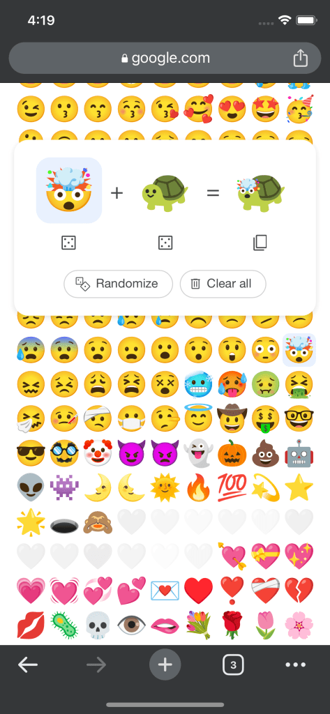 Emoji Kitchen in Google Search has a simplified design, with the ability to create random combinations or pick manual combinations. You can tap on the first emoji to choose which one starts the combination and then click the second emoji to either pick a random combination or another manual selection.