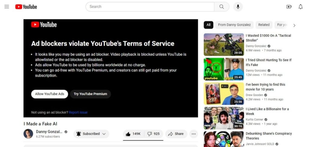 Numerous reports on Reddit over the past couple of weeks show the same desktop prompt to “Allow YouTube ads” or subscribe to YouTube Premium while threatening to block video playback after three videos have been played. As some users show, the prompt appears in place of videos themselves in some cases, or as a pop-up when in fullscreen viewing.