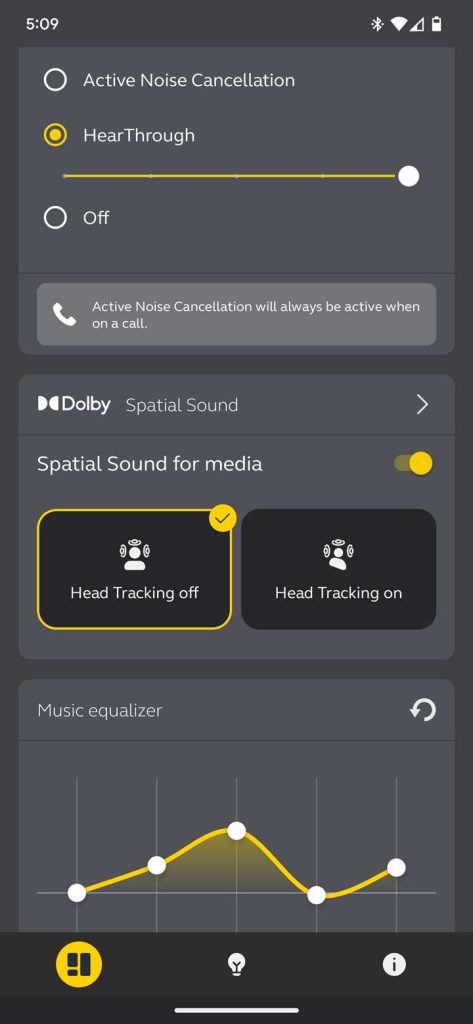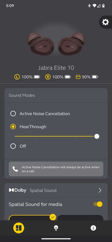 On Android, the ease of use goes even further with the Jabra Sound+ app’s silent control notification. That notification is simply a status bar at the bottom of your notification shade that displays quick information like head tracking and Dolby Atmos usage. A quick expansion lets you change ANC and pass-through mode with ease.