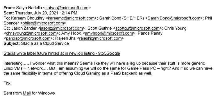 Documents from the ongoing FTC legal battle reveal that Microsoft CEO Satya Nadella emailed Phil Spencer (head of Xbox), Kareem Choudry (head of Xbox cloud gaming), and Sarah Bond (head of Xbox creator experience) at the Xbox team in regards to the reports that Google was working on a white-labeled version of Stadia, asking how Microsoft could do something similar.
