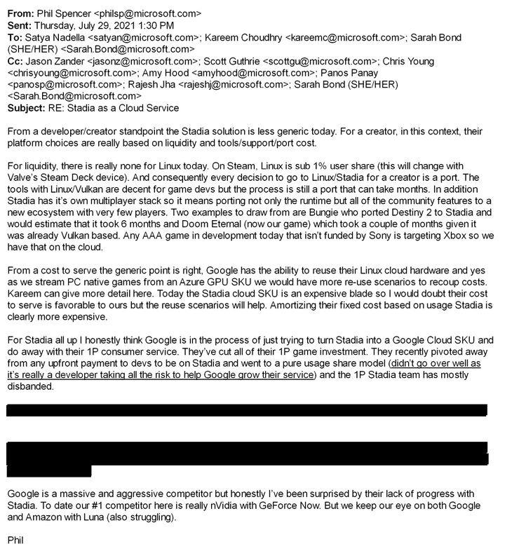 A lengthy email from Phil Spencer also went into comparing how Azure could handle the same reuse as Stadia was doing with Google’s cloud services. The executive also commented on the “lack of progress” Google was seeing with Stadia and how he was surprised by that, previously saying that he felt Google was trying to turn Stadia into a Google Cloud SKU and do away with their [first-party] service.”