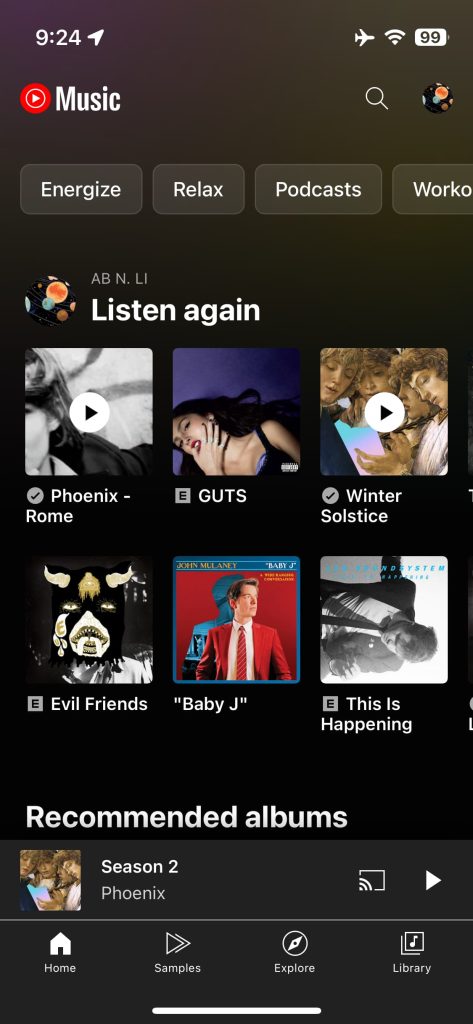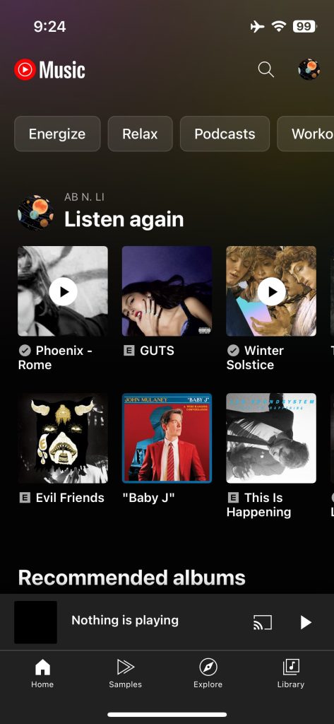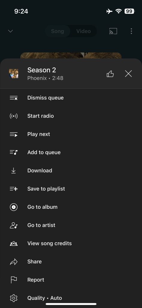 Lastly, you cannot swipe down on the miniplayer to clear your queue. To do so, open Now Playing and go to the overflow menu, which continues to grow, for “Dismiss queue” at the very top (instead of bottom on Android). This is more complicated than before and much less instantaneous. “Nothing is playing” will appear when there’s no active audio, like after an app restart.