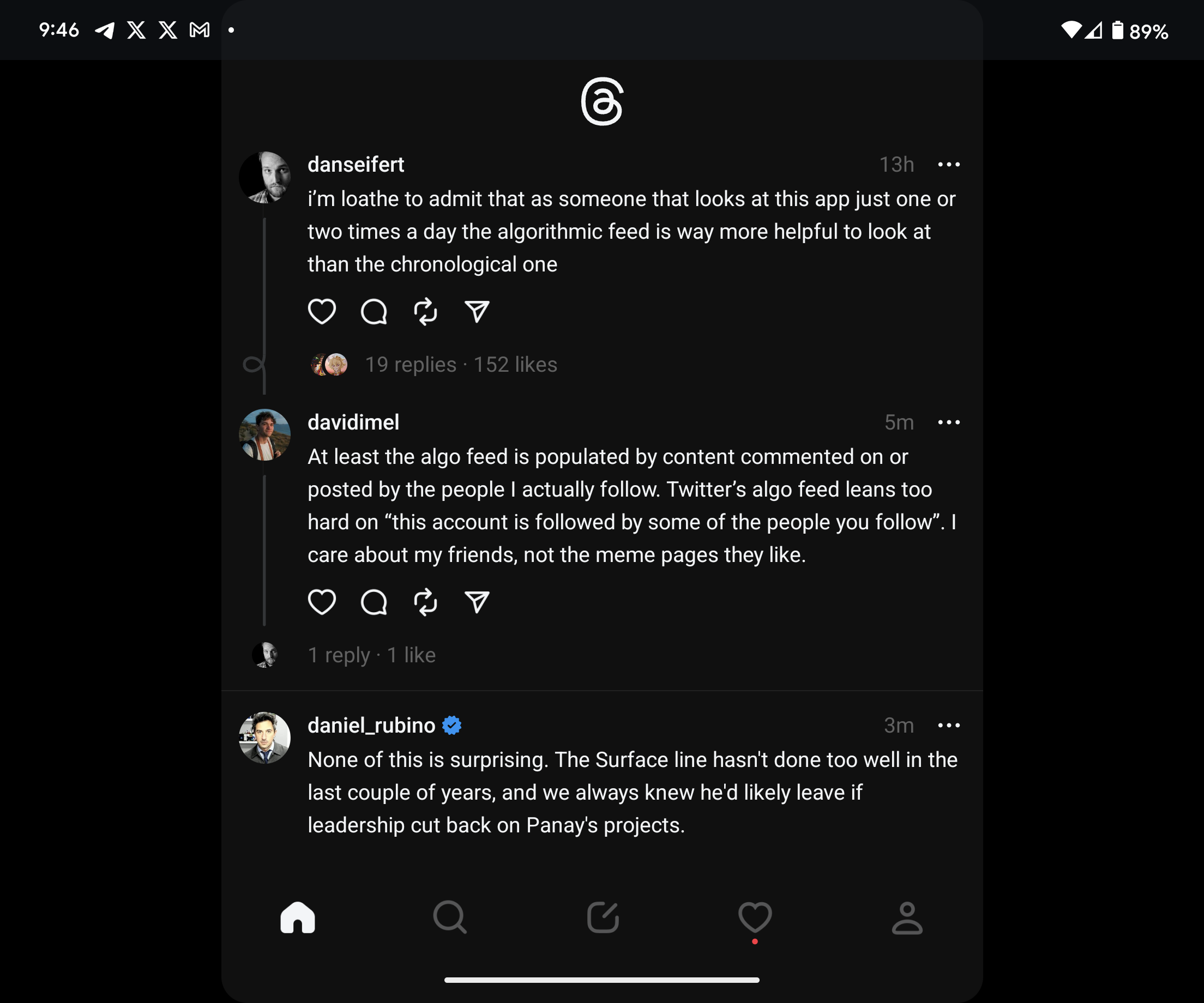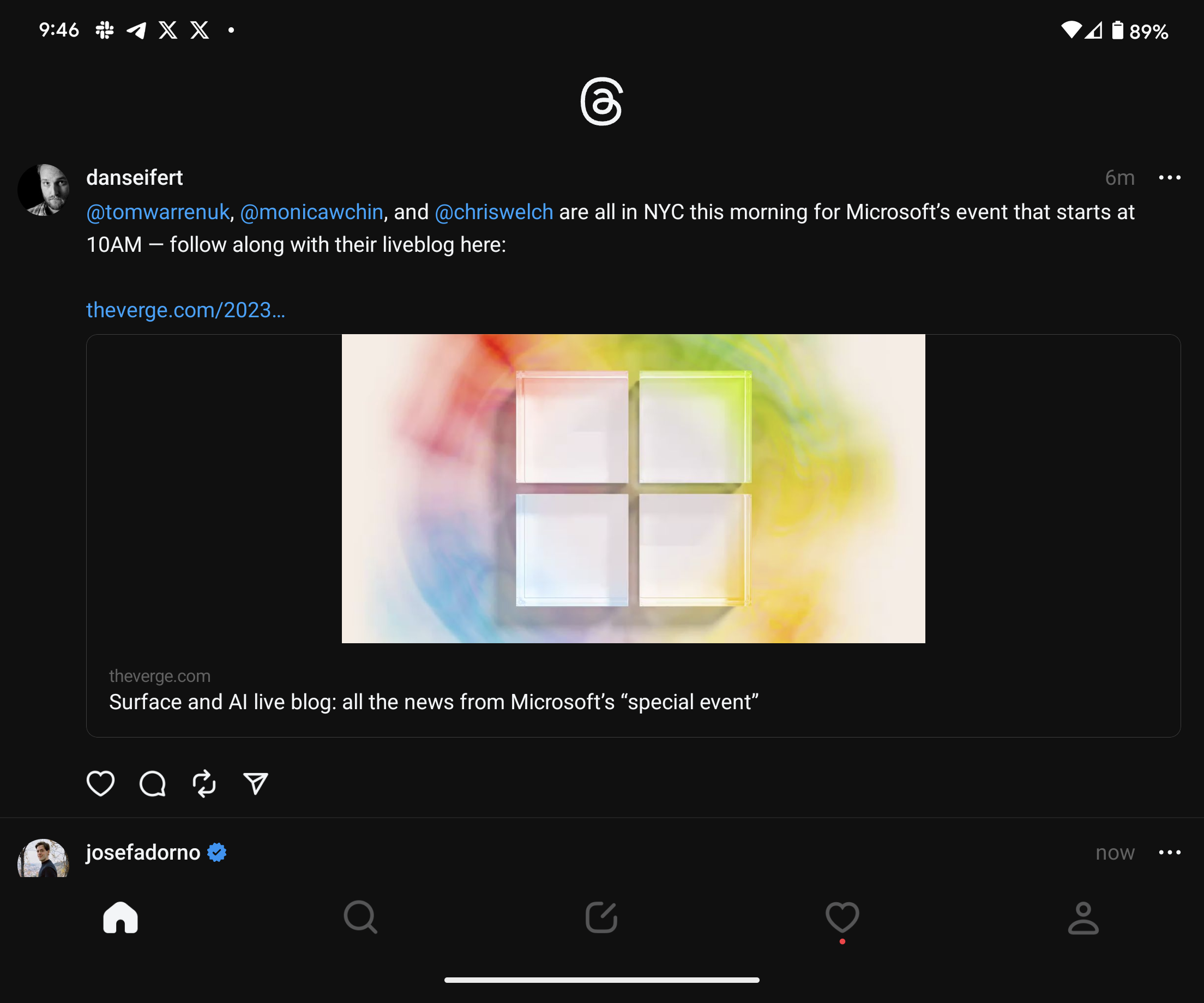 Twitter, or “X” as Elon stupidly insists it should be called, works surprisingly well on the fullscreen setup. On my Pixel Fold, the timeline condenses itself a bit to keep content looking clean, while the navigation takes up the whole display. Honestly, this is really good, and should be the default.